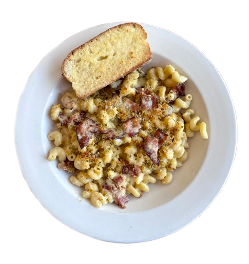 – Our house made cheese sauce and American cheese, cavatappi pasta, bacon and mozzarella topped with buttery bread crumbs